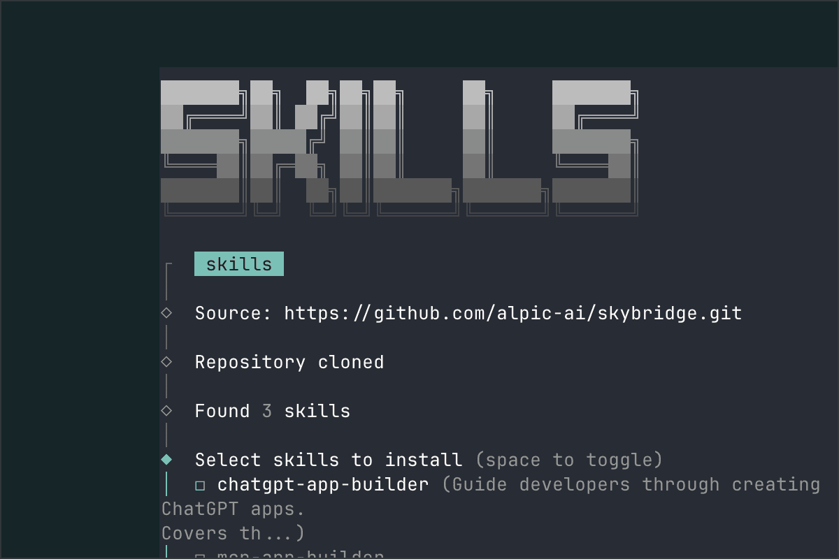 The Skill is publicly available via the Vercel Skills CLI: npx skills add alpic-ai/skybridge -s skybridge
