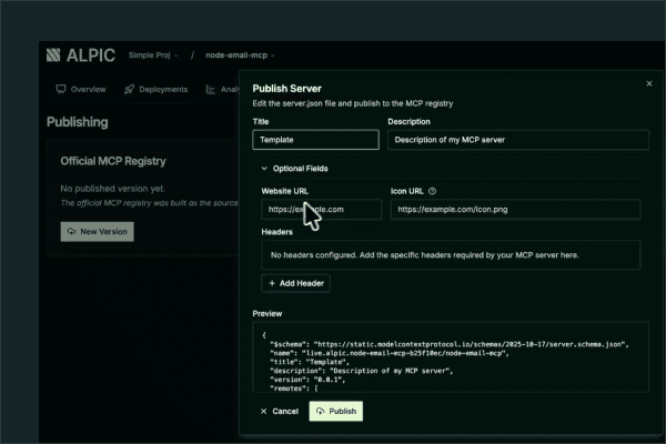Today, we’re taking a first step to formalize that commitment. Alpic now lets you publish your MCP server directly to the official MCP Registry.