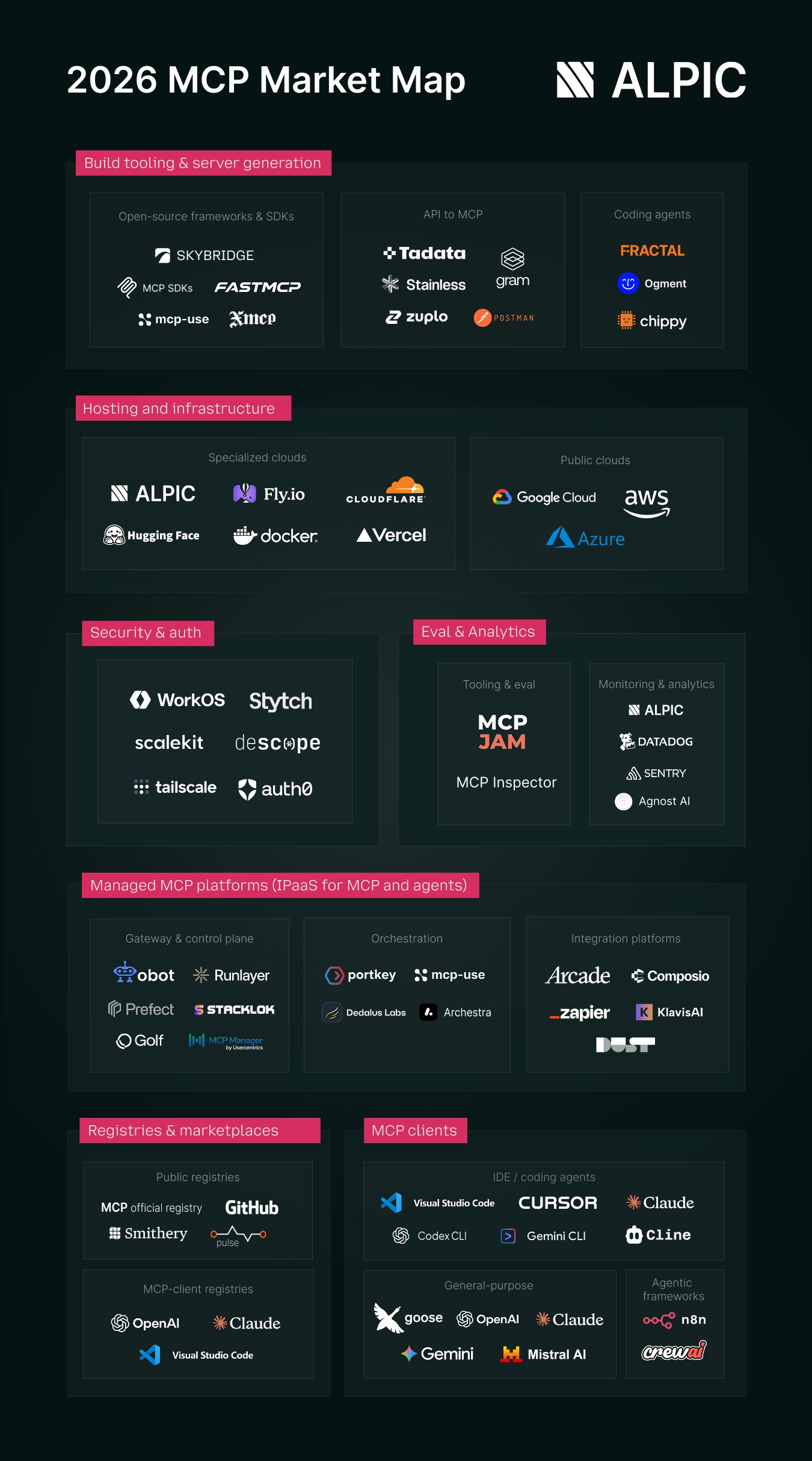 The map spans the full stack of what it takes to build, deploy, and use MCP in production: